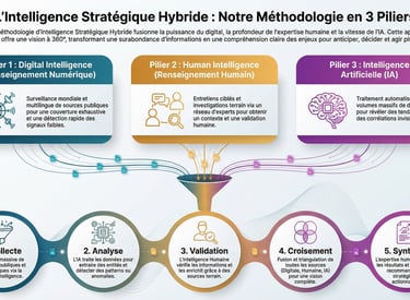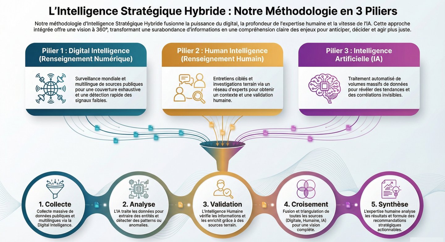 Notre méthodologie repose sur la convergence synergique de trois types d'intelligence complémentaires. Nous exploitons d'abord un large éventail de sources digitales multilingues (presse, bases de données spécialisées, registres publics) pour détecter les signaux faibles avec une couverture mondiale étendue. Nous menons ensuite des entretiens structurés avec des experts sectoriels et des sources terrain, apportant validation, contexte local et accès à des informations non publiques. Enfin, nos outils d'intelligence artificielle traitent de grandes quantités de données en quelques heures, détectent des connexions cachées et anticipent les évolutions futures grâce au Machine Learning et au Natural Language Processing multilingue. Cette approche hybride, fruit de plus de 25 ans d'expérience internationale, transforme l'information en intelligence actionnable et décisionnelle.